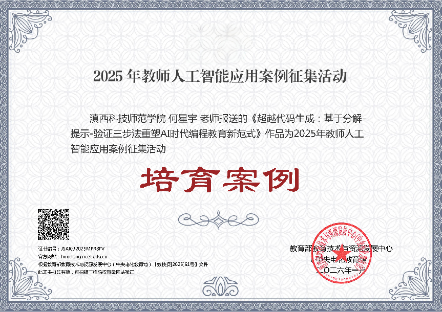 本次征集活动由教育部直属单位组织,面向全国各级各类学校教师,共征集案例4609件,竞争激烈。何星宇老师的作品立足当前人工智能技术发展前沿,聚焦编程教育中面临的现实挑战,创新性地提出了“分解-提示-验证”三步教学法,旨在利用人工智能工具辅助教学,促进学生计算思维与问题解决能力的实质性提升,体现了鲜明的创新意识和实践导向。该案例从众多作品中脱颖而出,是对其教学改革探索成果的充分肯定。